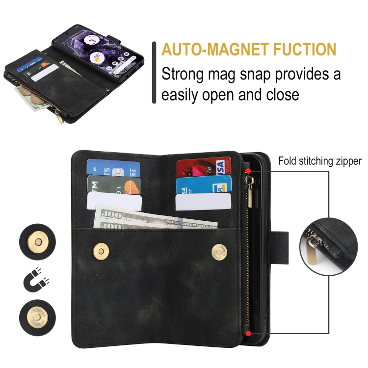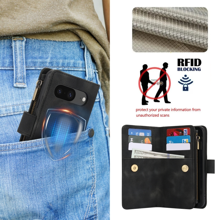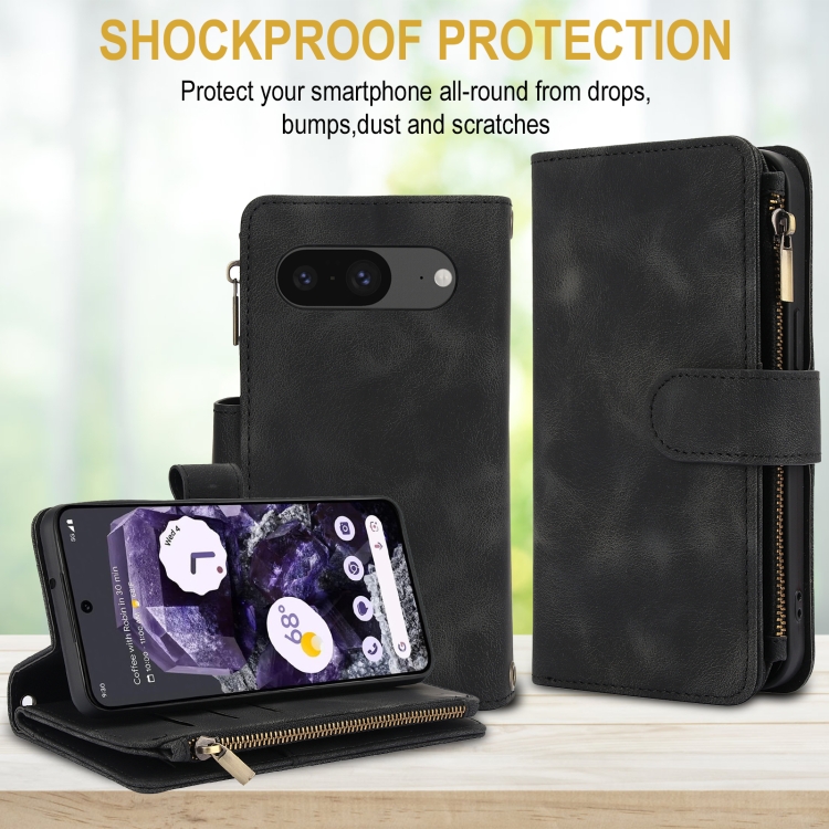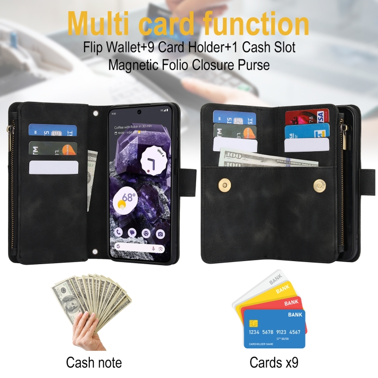 Funda de Cuero Rfid con Cremallera y Cordón para Google Pixel 8 Dream con 9 Tarjetas (Negro)