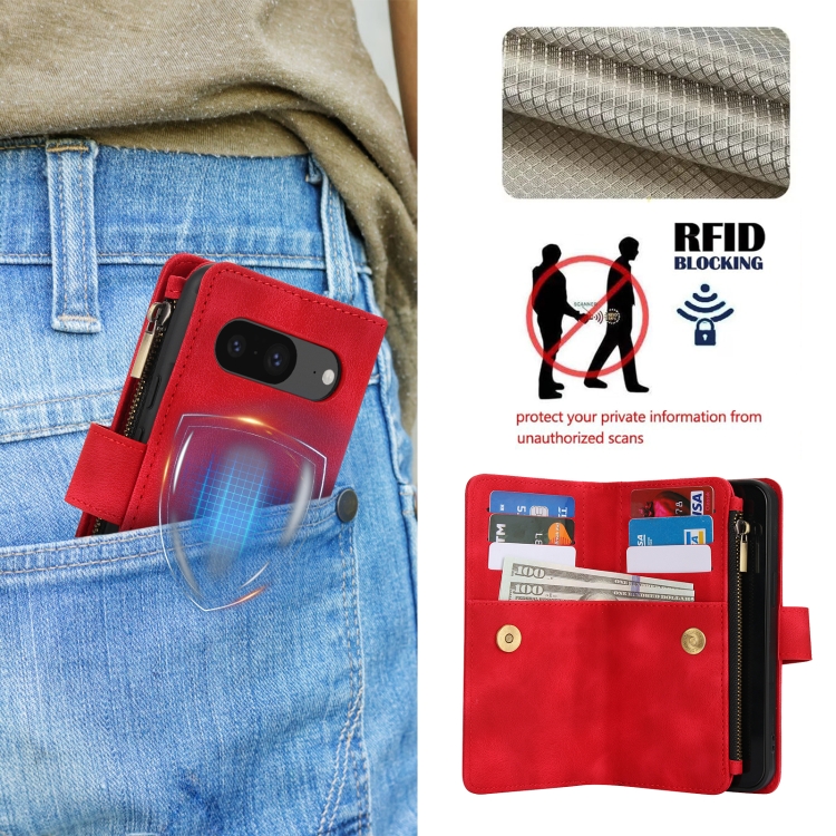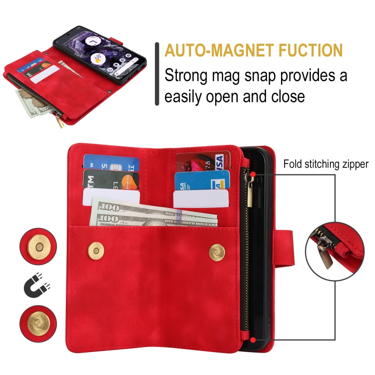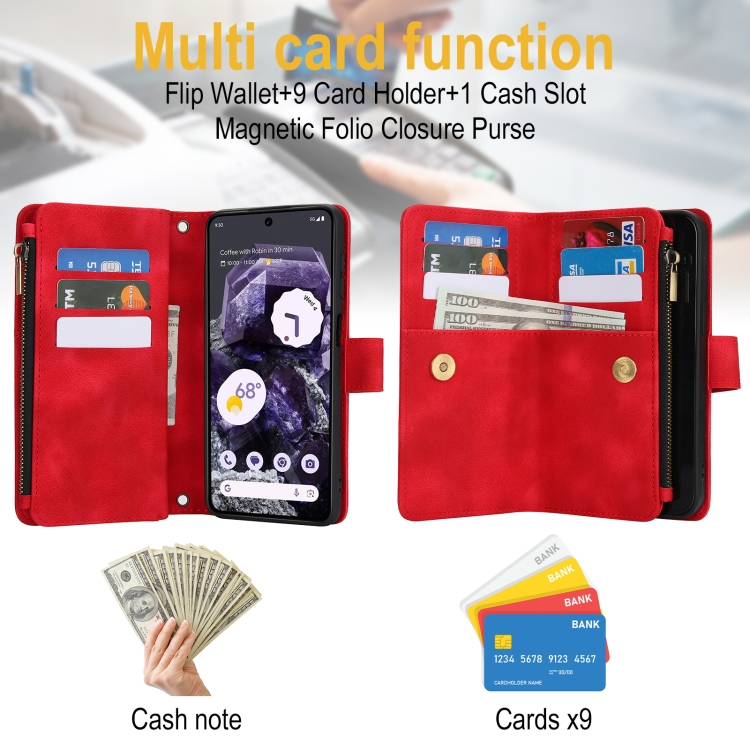 Funda de Cuero Rfid con Cremallera para Google Pixel 8 Dream con 9 Tarjetas y Cordón (Rojo)