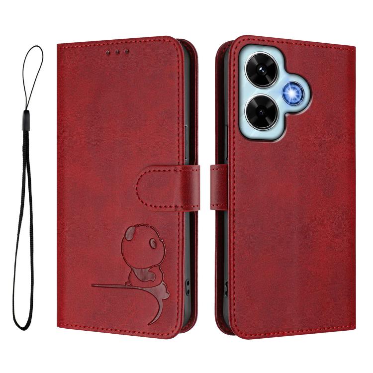 Funda de cuero RFID con estampado de panda y cordón para Redmi Note 13 4G (rojo vino)