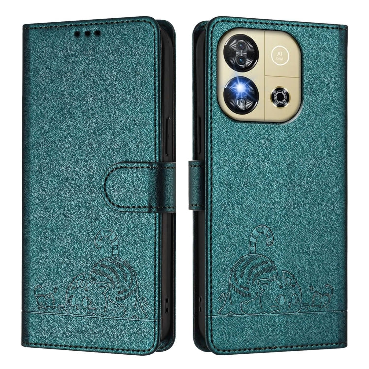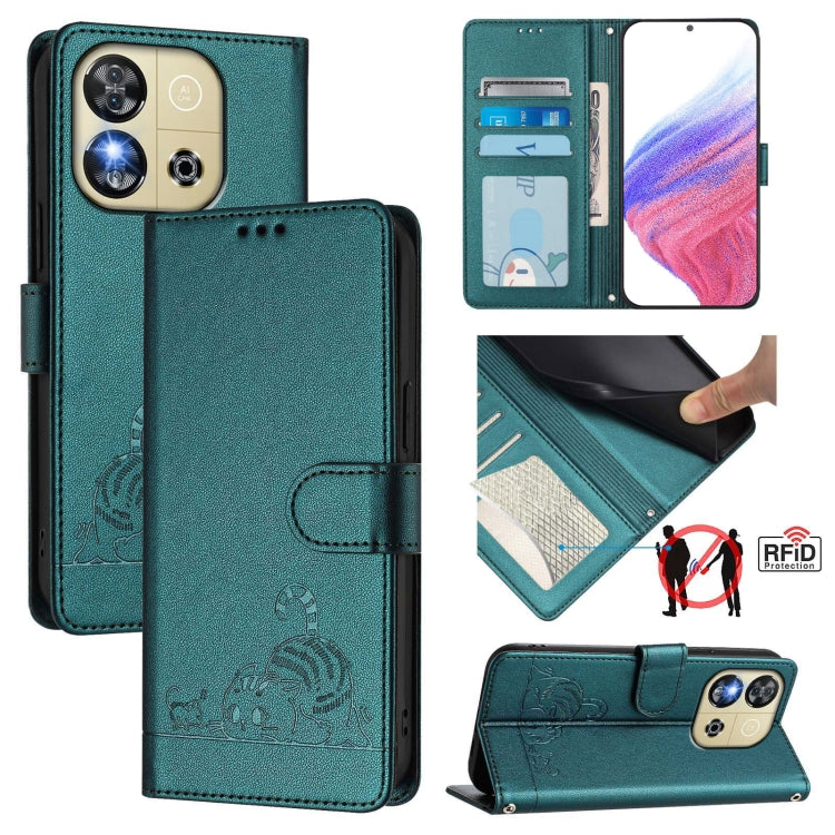 Funda de Cuero Rfid para Oukitel C57S con Estampado de Rata y Gato en Relieve y Cordón (Verde Pavo Real)