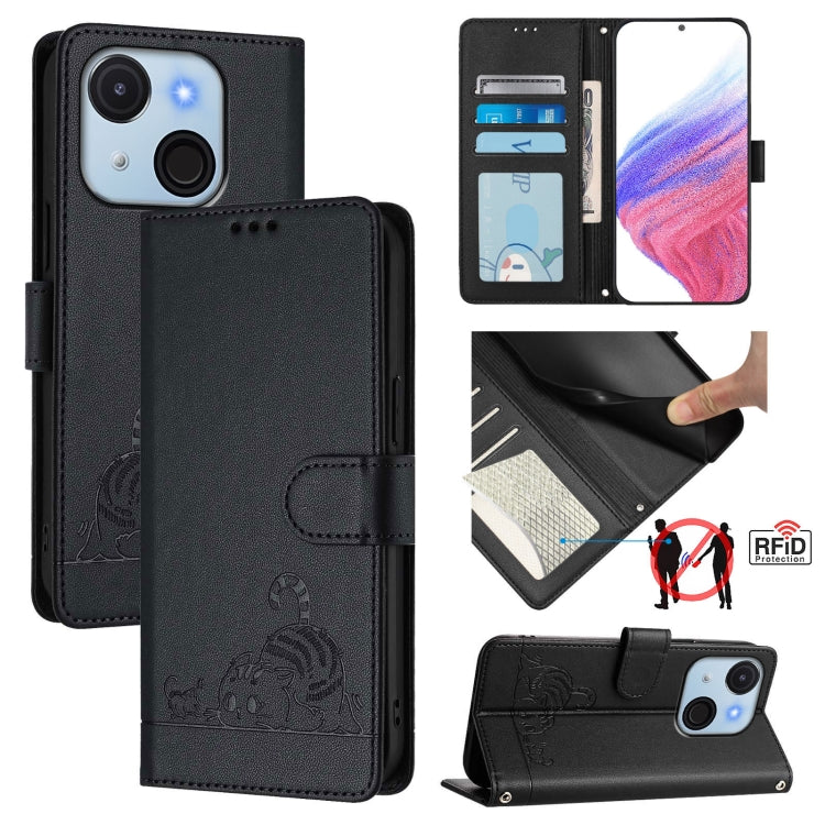 Funda de Cuero Rfid para Teléfono Itel A50C con Estampado de Rata y Gato y Cordón (Negro)