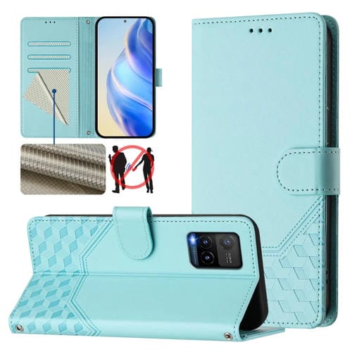 Funda de Cuero Rfid con Relieve de Panal para Vivo Y33S 4G / Y21 2021 / Y21S / Y21T (Verde Menta)