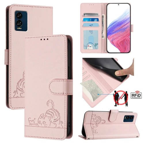 Funda de Cuero RFID para Blu View Speed 5G con Relieve de Rata y Gato y Cordón (Rosa)
