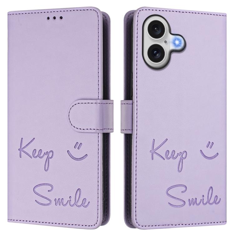 Funda de cuero RFID con relieve de sonrisa para iPhone 17 (morado claro)