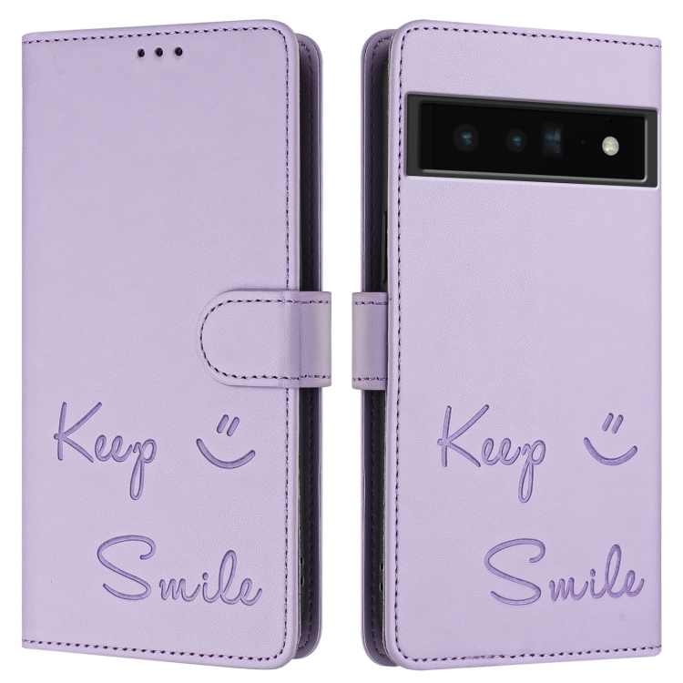 Funda de Cuero Rfid con Relieve Sonriente para Google Pixel 6 Pro (Morado Claro)