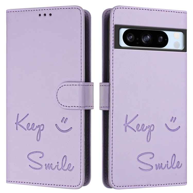 Funda de Cuero Rfid con Relieve Sonriente para Google Pixel 8 Pro (Morado Claro)