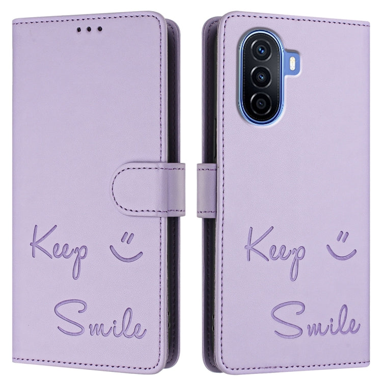 Funda de Cuero Rfid con Relieve Sonriente para Huawei Enjoy 50 4G (Morado Claro)