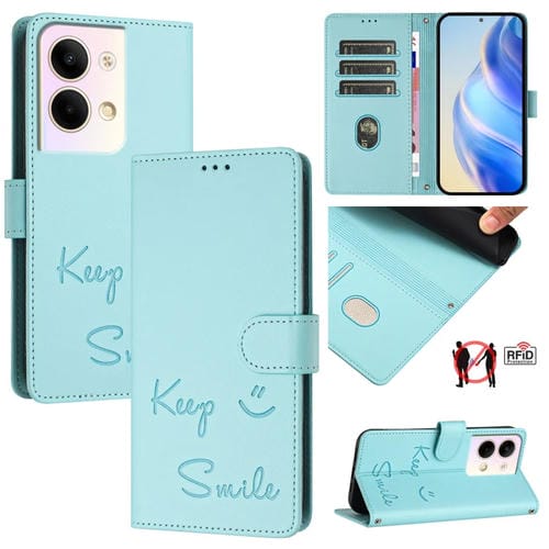 Funda de Cuero Rfid con Relieve Sonriente para Oppo Reno 9 5G/Reno 9 Pro 5G (Verde Menta)