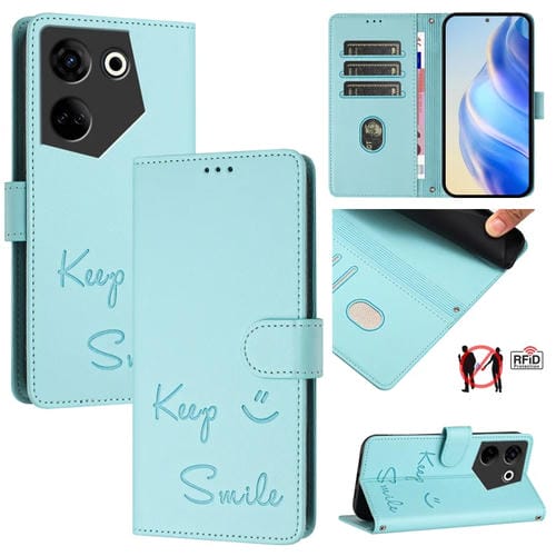 Funda de Cuero RFID con Relieve Sonriente para Tecno Camon 20/20 Pro 4G (Verde Menta)