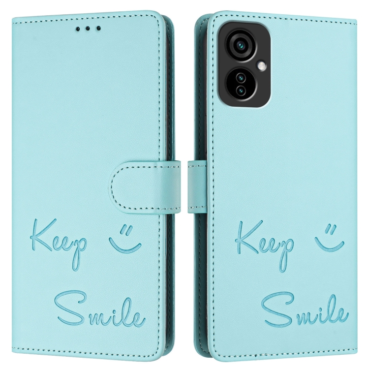 Funda de Cuero RFID con Relieve Sonriente para Tecno Spark 9 Pro y Spark 9T (Verde Menta)