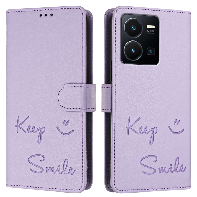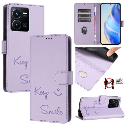 Funda de Cuero Rfid con Relieve Sonriente para Vivo Y77 5G Global / Y77E 5G (Morado Claro)
