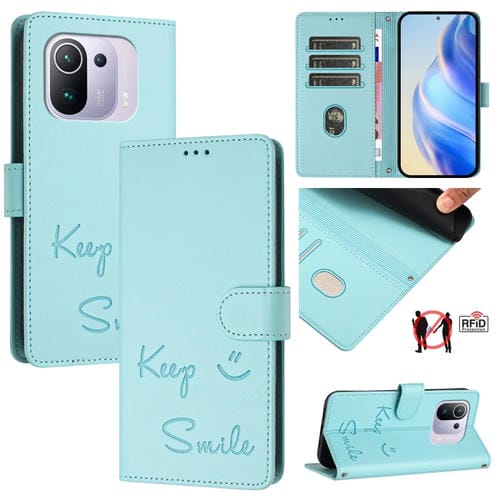 Funda de Cuero Rfid con Relieve Sonriente para Xiaomi Mi 11 Pro (Verde Menta)