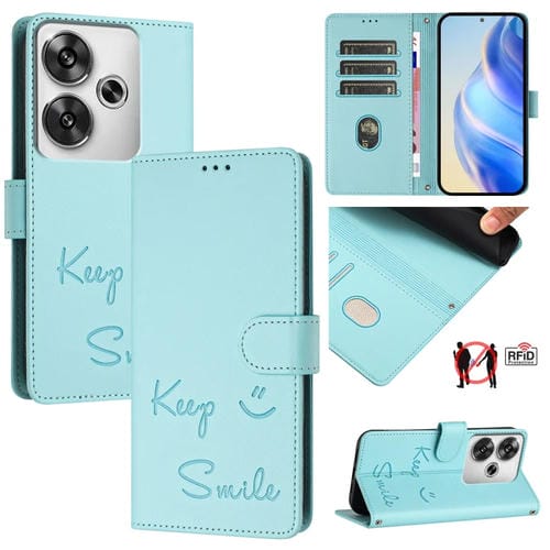 Funda de Cuero Rfid con Relieve Sonriente para Xiaomi Poco F6 5G (Verde Menta)