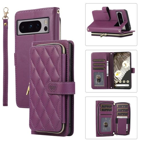 Funda de Cuero Tipo Billetera con Cremallera Completa y Diseño Rombal para Google Pixel 8 Pro (Morado Oscuro)