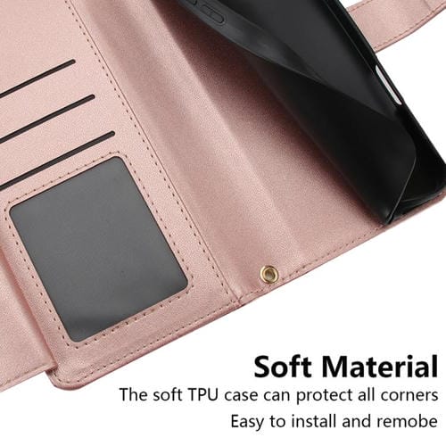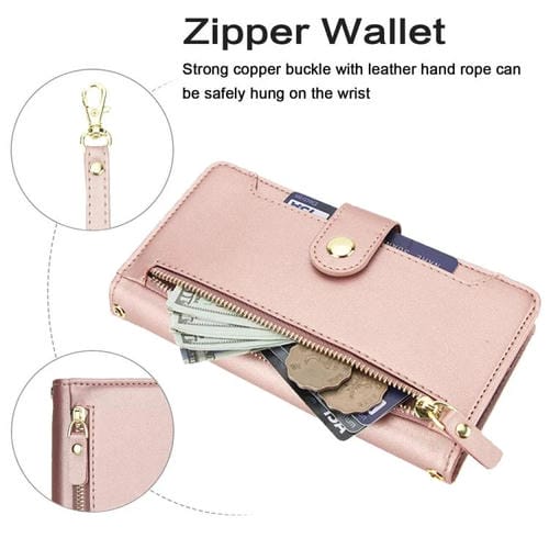 Funda de cuero tipo billetera con cremallera y siete ranuras para tarjetas para iPhone 17 (oro rosa)
