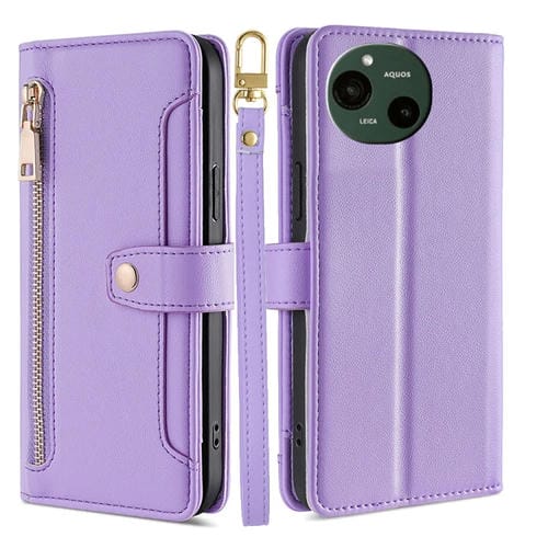 Funda Cuero Tipo Billetera Sharp Aquos R9 con Cremallera y Textura Oveja (Morado)
