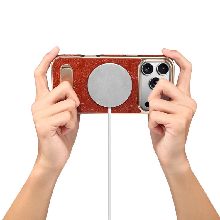 Funda de piel auténtica MagSafe con soporte para iPhone 17 Pro Denior A25 con textura de flores retro (rojo)