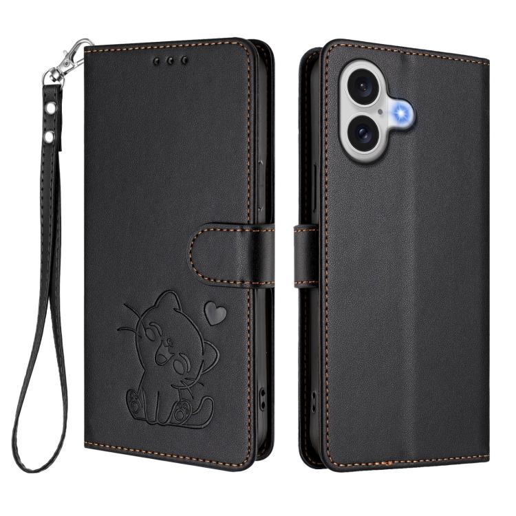 Funda de piel con diseño de gato y corazón en relieve para iPhone 17 con correa de mano (negra)