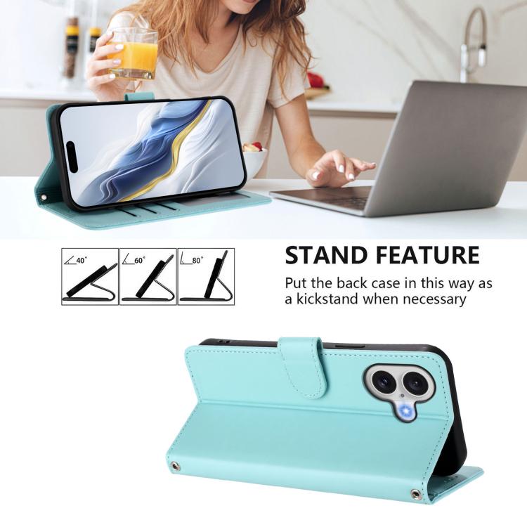 Funda de piel con diseño de gato y corazón en relieve para iPhone 17 con correa de mano (verde menta)