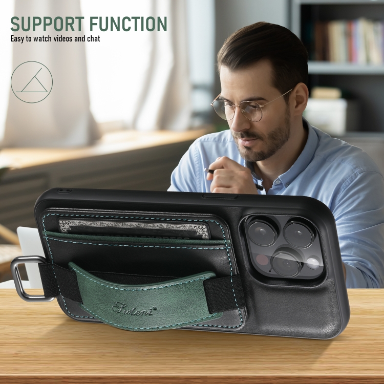 Funda de Pu para iPhone 16 Pro Max Suteni H13 con Tarjetero y Correa para la Muñeca (Negra)