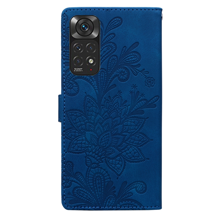Funda de Teléfono con Hebilla Magnética de Pu con Encaje Floral En Relieve para Redmi Note 11 Global con Correa para la Muñeca (Azul)