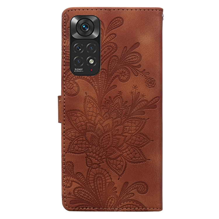 Funda de Teléfono con Hebilla Magnética de Pu con Encaje Floral En Relieve para Redmi Note 11 Global con Correa para la Muñeca (Marrón)