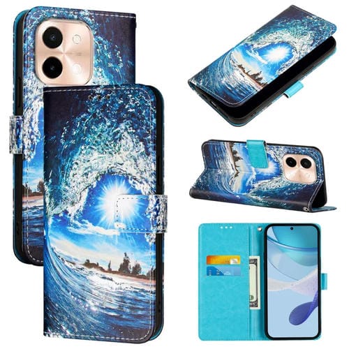 Funda de Teléfono de Cuero con Patrón de Dibujo de Colores y Tejido Liso para Vivo Y28 4G (Ondas y Sol)