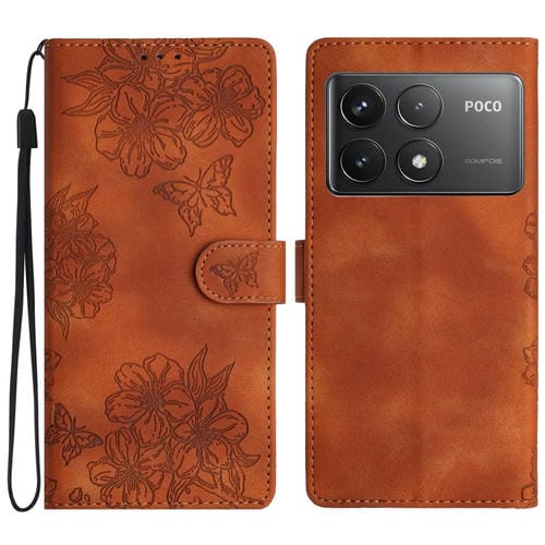 Funda de Teléfono de Pu con Relieve de Piel de Mariposa y Diseño de Flor de Cerezo para Xiaomi Poco F6 Pro (Marrón)