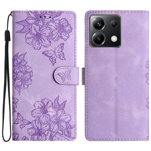 Funda de Teléfono de Pu con Relieve de Piel de Mariposa y Diseño de Flor de Cerezo para Xiaomi Poco X6 (Morado)
