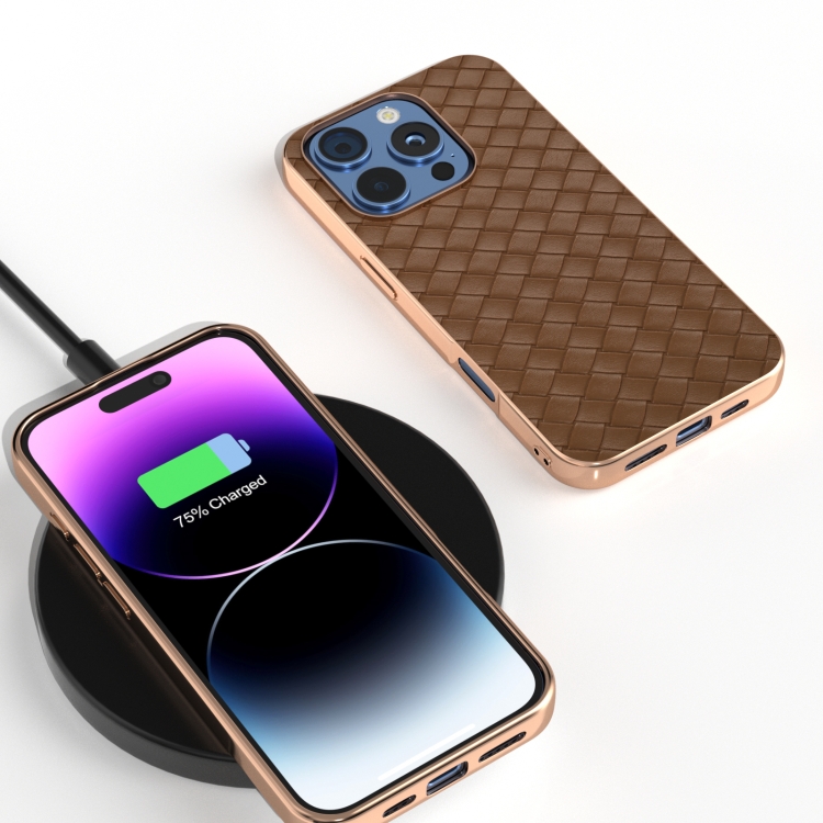 Funda de teléfono PU con textura tejida y marco galvanizado para iPhone 16 Pro Max (Marrón)