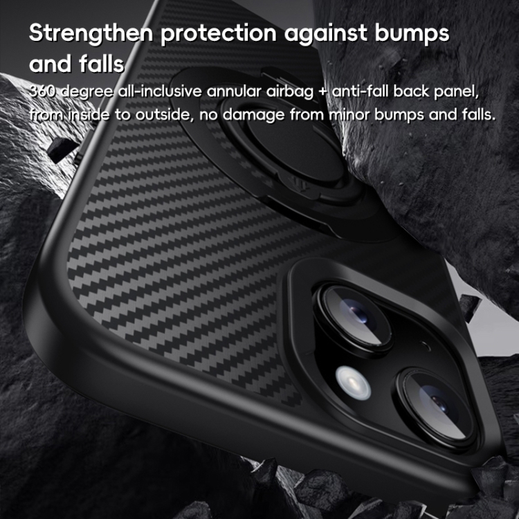 Funda de Teléfono Magsafe Fibra de Carbono para iPhone 15 Plus 14 Plus con Soporte Giratorio 360 Grados (Oro Negro)
