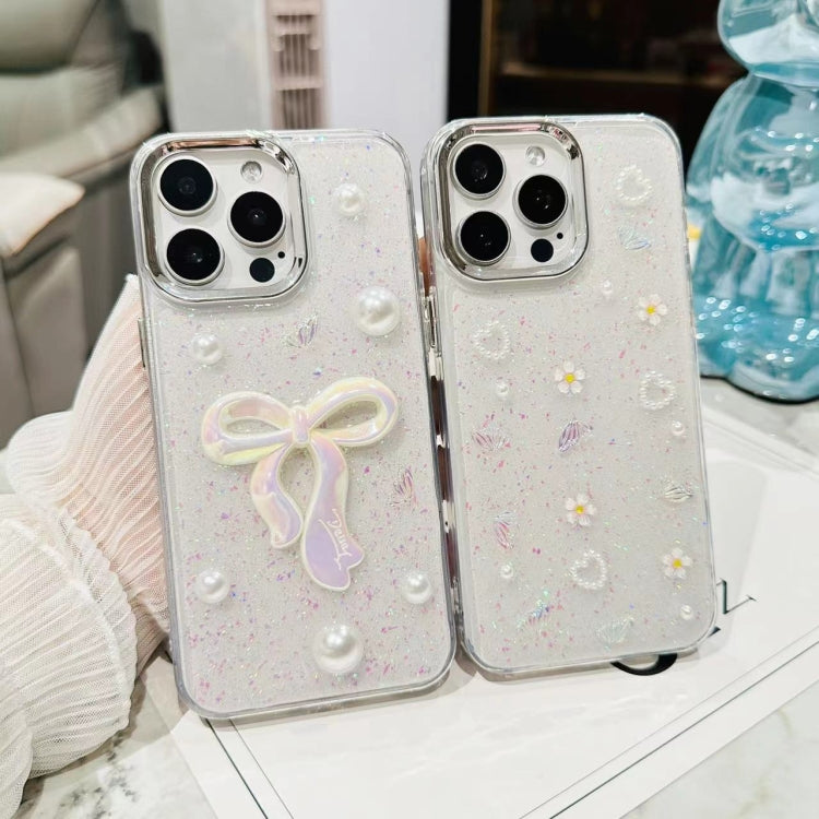 Funda TPU con Lazo 3D y Flores de Amor y Perlas para iPhone 16 Pro Max (Lazo de Perlas)