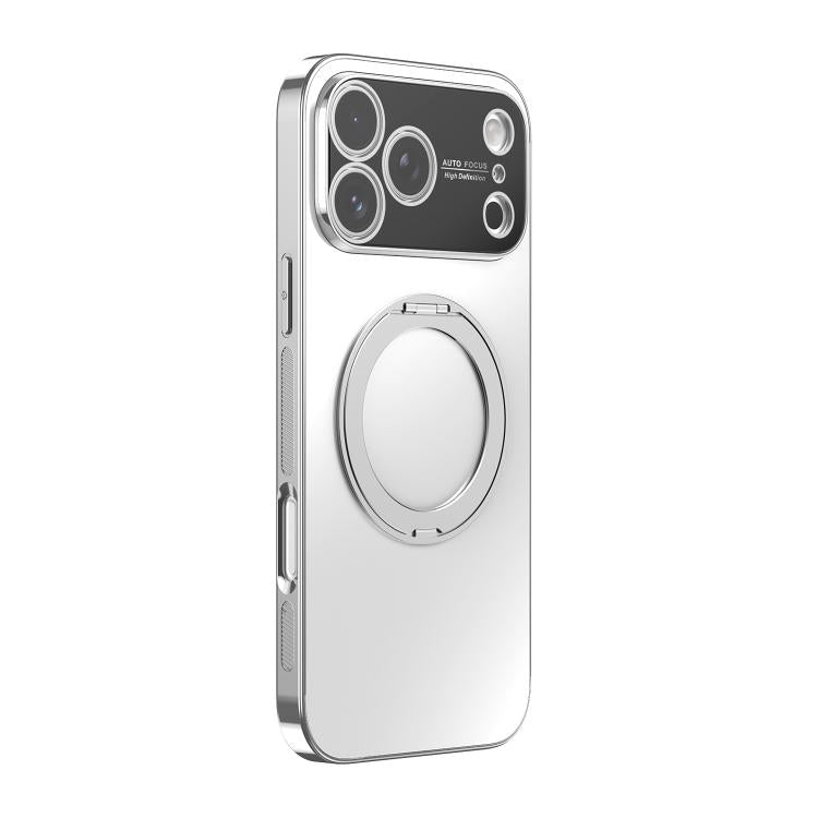 Funda MagSafe electrochapada para iPhone 17 Pro Max con soporte giratorio de 360 grados y cubierta para lente (blanca).
