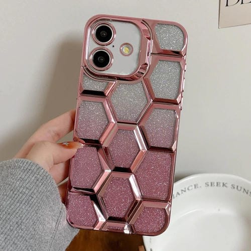 Funda para iPhone 16 Grabado Láser Galvanoplastia Purpurina Panal 3D (Rosa)
