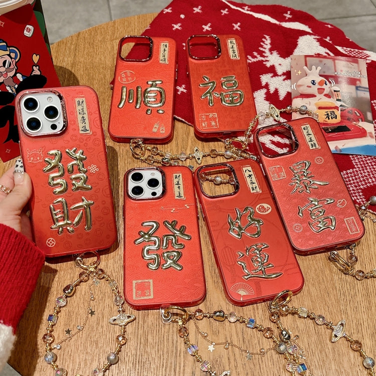 Funda para iPhone 16 Pro Max Diseño Año Nuevo Estampado Dorado 3D Imd Cadena de Cristal (Buena Suerte)