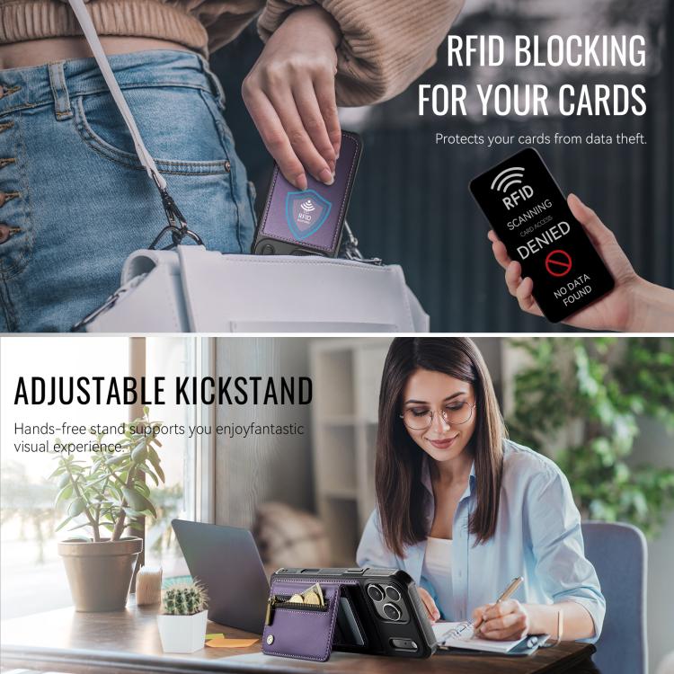 Funda para iPhone 17 Pro JEEHOOD J12 con cremallera RFID MagSafe y tarjetero (morado)