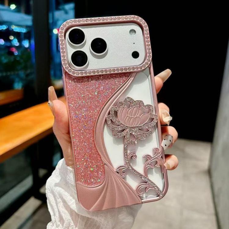 Funda para iPhone 17 Pro Max de TPU electrochapado con loto, calada, con diamantes de imitación y purpurina (rosa)