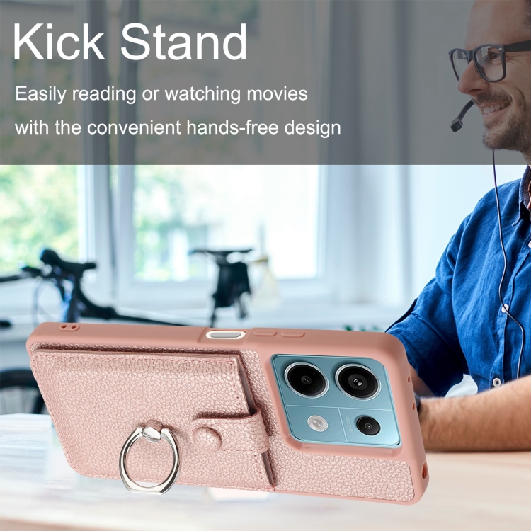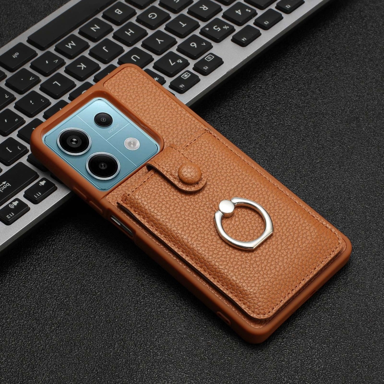 Funda para Teléfono con Diseño de Textura de Lichi para Redmi Note 13 5G, con Soporte para Anillo y Diseño de Tarjeta (Marrón)
