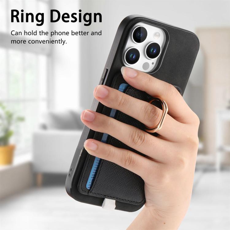 Funda para Teléfono iPhone 13 Pro Max Ranuras para Tarjetas Anillo Cuero Diseño Retro Cruzado (Negro)