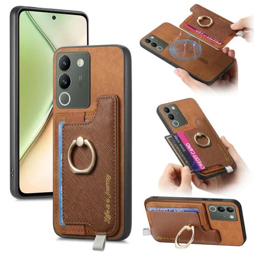 Funda para Teléfono con TaRJetero y Anillo de Cuero con Diseño Retro Magsafe Cross para Vivo Y200/V29E (Marrón)