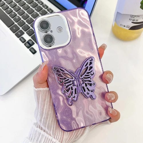 Funda para Teléfono TPU iPhone 16 Plus Textura Brillante Soporte Mariposa Película Lente (Arrugas Moradas)