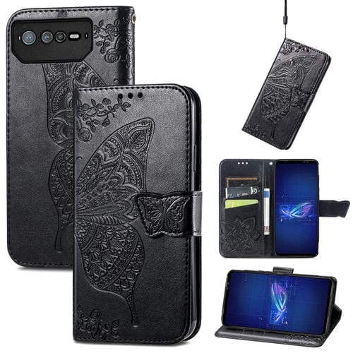 Funda de Cuero para Asus Rog Phone 6 Butterfly Love Flower con Tapa en Relieve (Negro)
