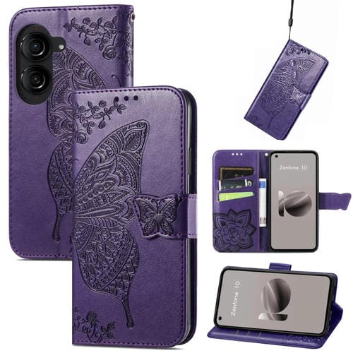 Funda para Asus Zenfone 10 de Cuero con Relieve Flor de Amor y Mariposa (Púrpura)