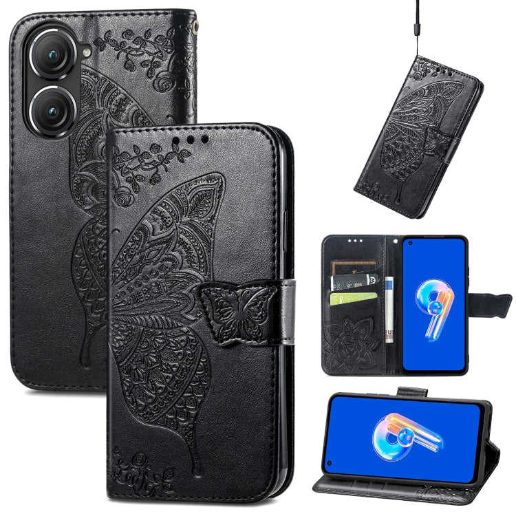 Estuche para Asus Zenfone 9 Butterfly Love Flower en Cuero en Relieve (Negro)