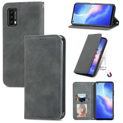 Funda de Cuero Magnética para BlackView A90 Retro con Soporte, Ranuras y Marco Fotografía (Gris)