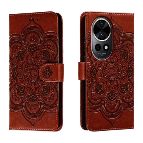 Funda de Cuero Huawei Nova 12 Pro con Patrón en Relieve Sun Mandala (Marrón)