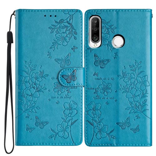 - 1x Funda para Huawei P30 Lite de Cuero con relieve de flor y mariposa (Azul)