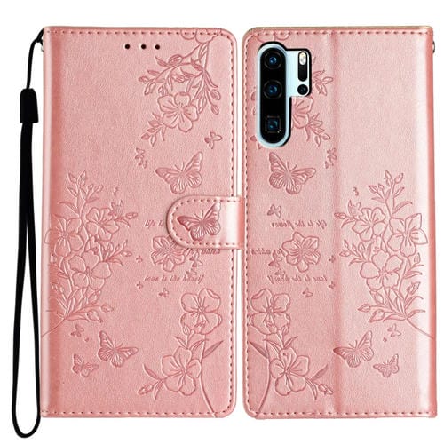 Funda de Cuero Huawei P30 Pro Butterfly Love Flower en Relieve (Oro Rosa)