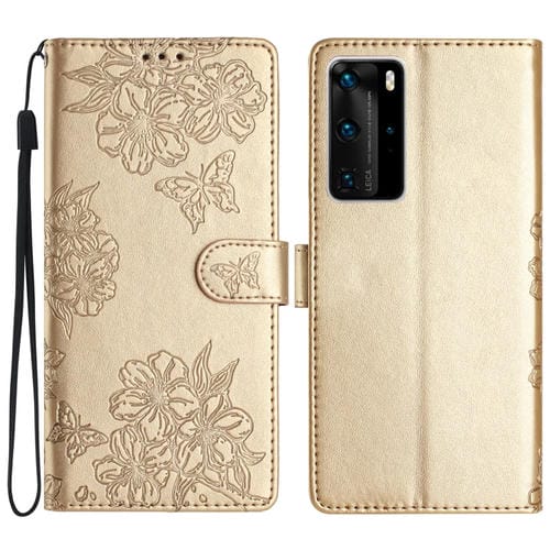- 1x Funda para Huawei P40 Pro Cherry Blossom Butterfly Skin Feel de PU en relieve (Oro)