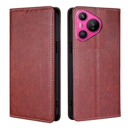 Estuche para Huawei Pura 70 de Cuero Magnético Color Sólido y Aceite Brillante (Marrón)